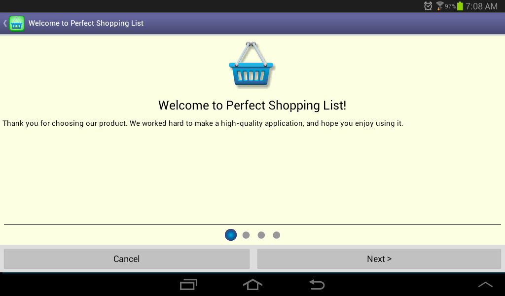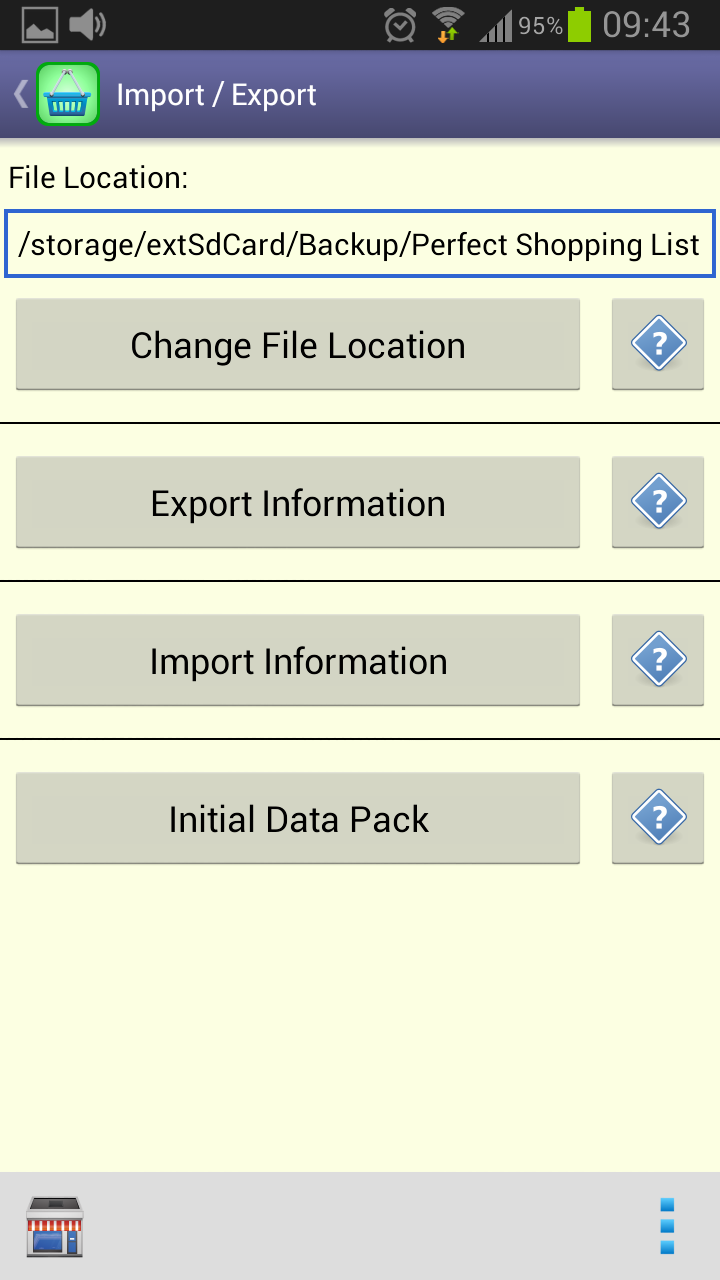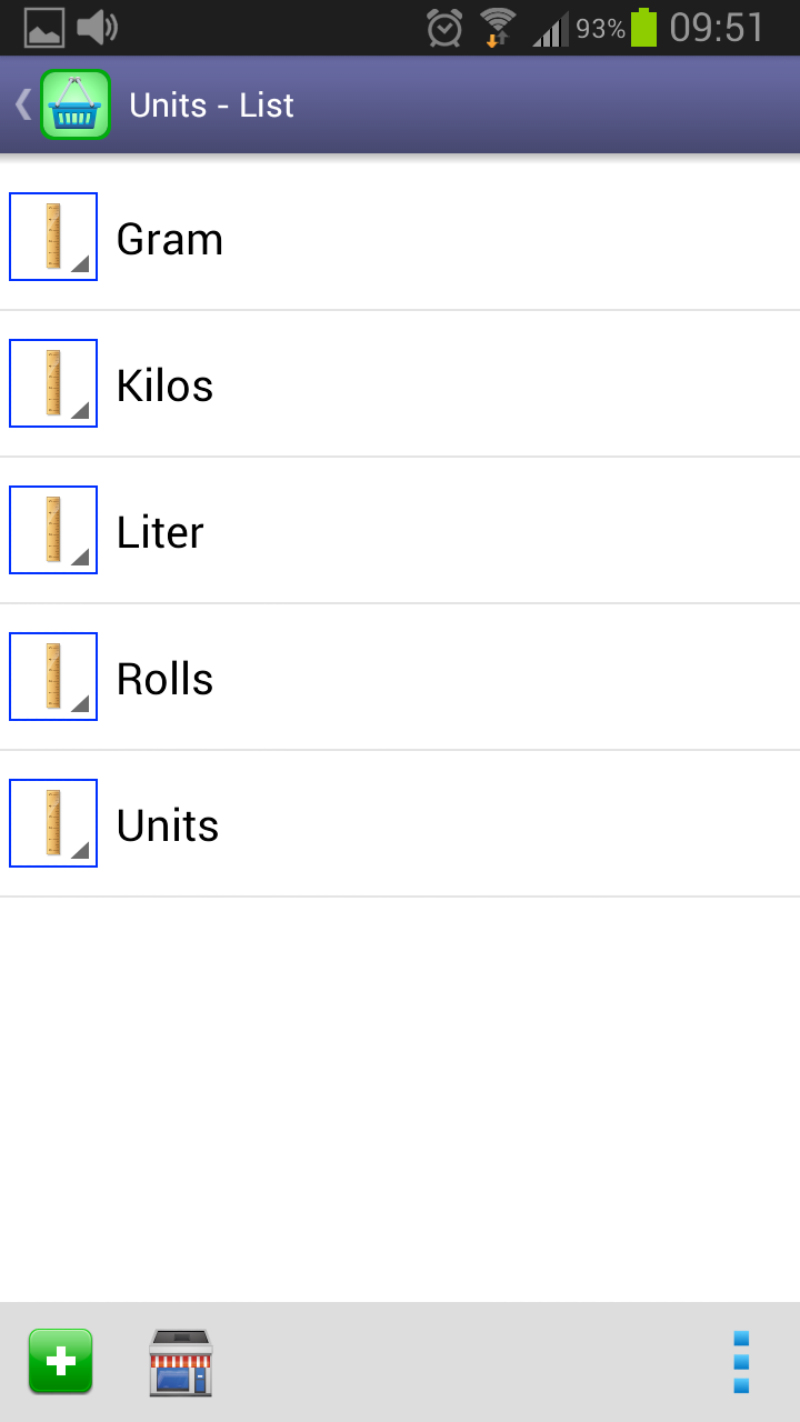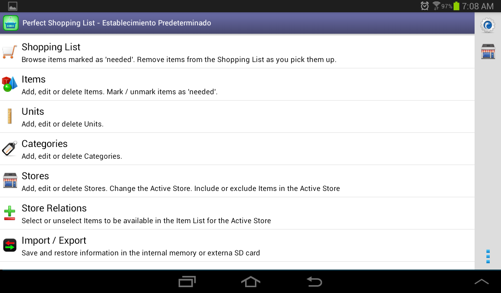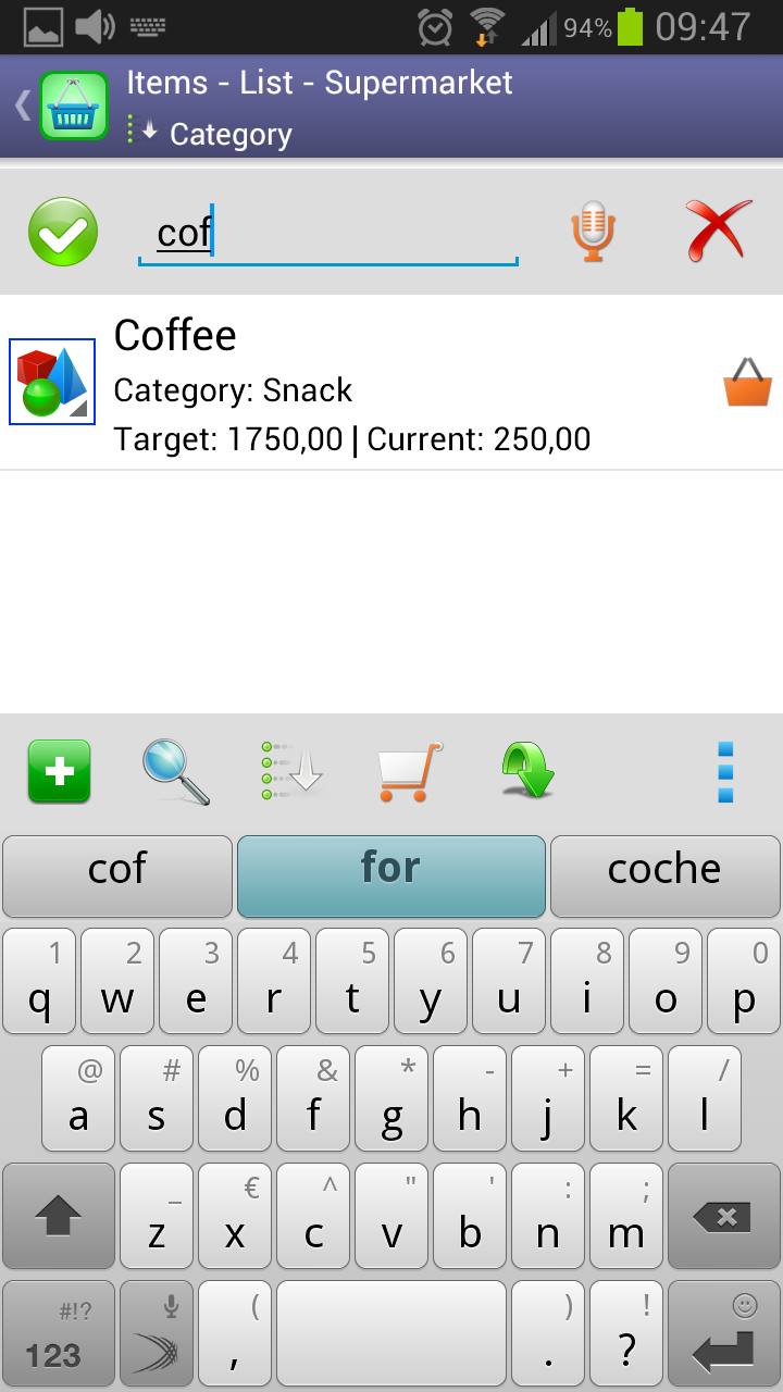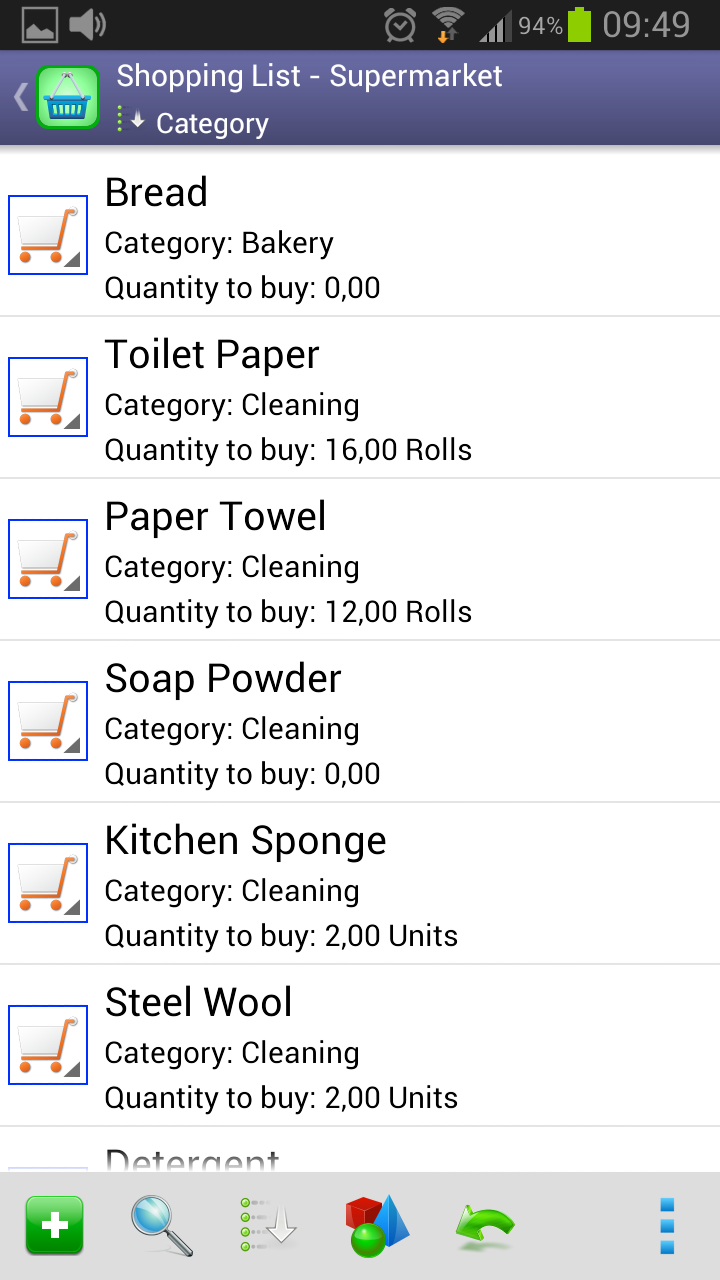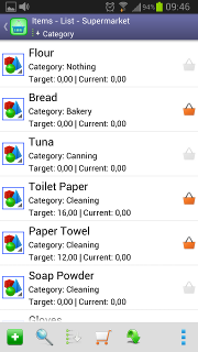 Shopping ListThis is the list you should use while doing shopping.Here you only see the items marked as “necessary”. A tap over an item will clear its necessity and remove it from the list. The quantities shown in the third line represent how many it is necessary to buy from a given item in order to achieve the target stock. In addition it is also available the possibility of doing sorts both by description or by category. Your sort preference will be saved and restored the next time you enter in this function. |