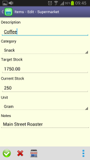 Item ListFrom here you can add, edit or delete items.When an item is marked as “necessary”, its basket icon is highlighted. From this function it is also possible to perform additional tasks like reset current stocks and erase "Necessary" marks. It is also available the possibility of doing sorts both by description or by category. Your sort preference will be saved and restored the next time you enter in this function. This list only show items associated with the active store. For additional information, check the section Store List. The active order is shown on the information panel, in the top area or at the left according to the screen orientation. |